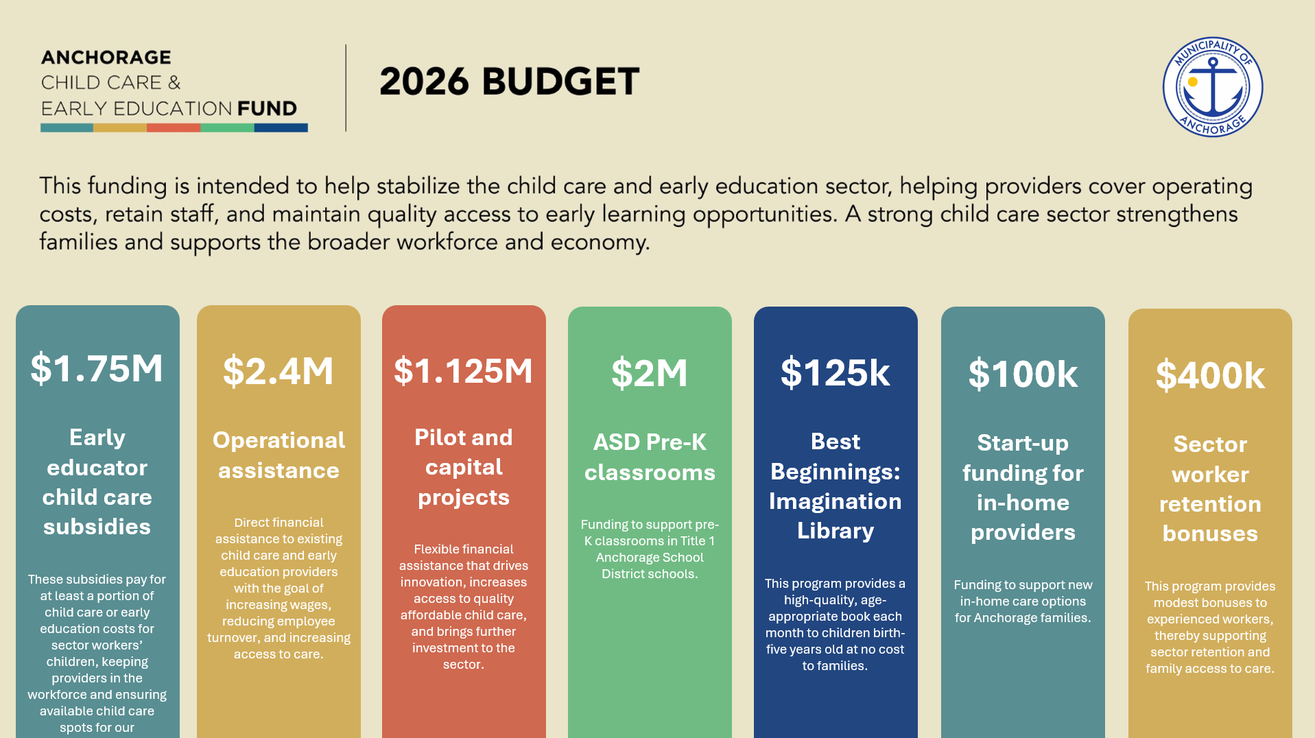 Pilot Project and Capital Funding. $2M in 2025. Flexible financial assistance that drives innovation, increases access to quality, affordable child care, and brings further investment in the sector. The Municipality put out a Request for Grant Proposals for this funding in April 2025, and it closed in May 2025. Twenty organizations from around the Municipality were approved for funding in 2025. For more information, please see Anchorage Assembly Memorandum 520-2025, which describes the funded projects.